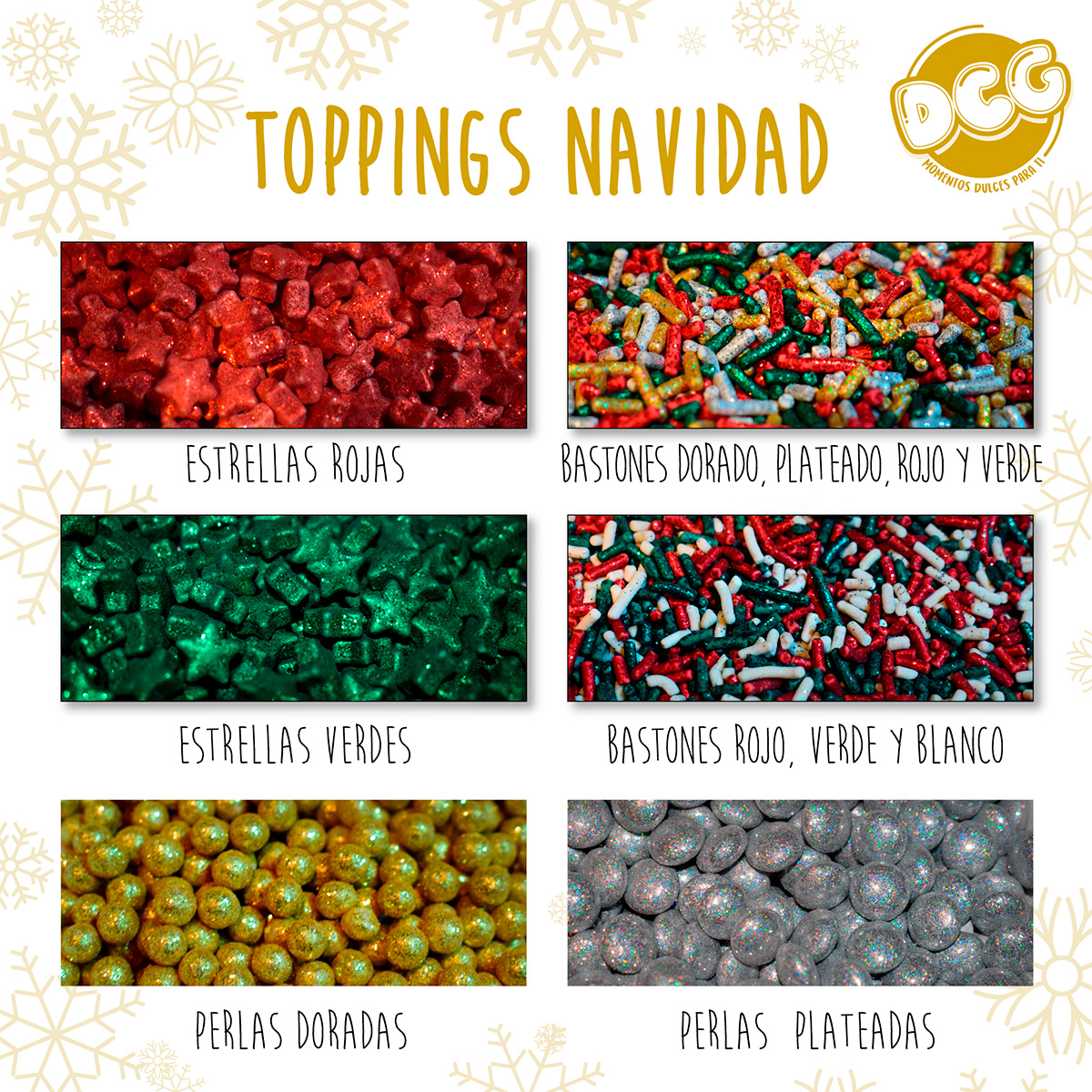En esta categoría, encontramos un amplio surtido de grageas, perlas, toppings, dulces duros y de chocolate, los cuales son ideales para decoraciones de cupkapes, tortas, muffins, galletas y mesas de dulces.